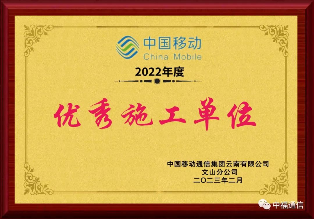近日,北京中福通信工程有限公司云南分公司在文山地區(qū)移動(dòng)通信工程中項(xiàng)目建設(shè)中,榮獲中國(guó)移動(dòng)通信集團(tuán)云南有限公司文山分公司頒發(fā)的“2022年度優(yōu)秀施工單位”榮譽(yù)稱號(hào)。